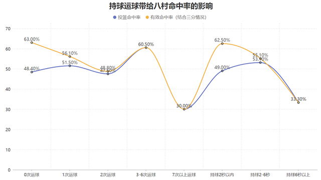 八村接球不运球出手的投篮以及有效命中率均为最高值,除此之外简单运球后的出手也尚能保持一定的效率,但7次运球以上的出手命中率断崖式下降,而八村这样的得分方式无疑最契合现在的湖人体系。