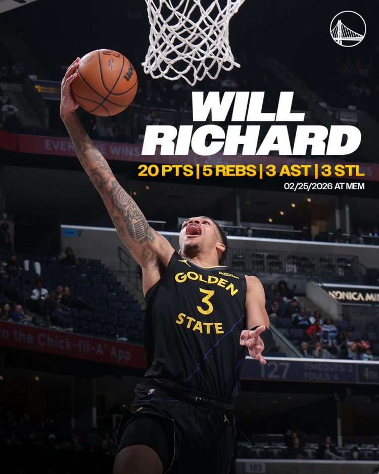 勇士官方晒出理查德海报,理查德成为自2012年4月16日的克莱·汤普森之后,首位打出这一数据的勇士新秀👏。