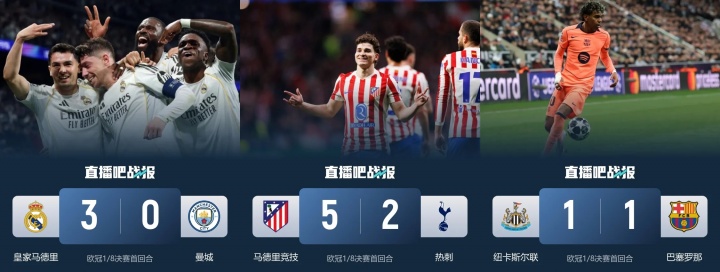 其中皇马送给曼城3-0的惨败,马竞送给热刺5-2的惨败,巴萨则是客场1-1平纽卡。目前三队晋级欧冠8强的概率都高于对手。