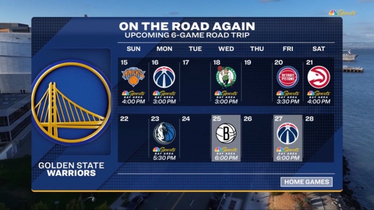 转播方晒出本场过后勇士的赛程,他们将开启六连客,对手分别为尼克斯、奇才、凯尔特人、活塞、老鹰和独行侠。